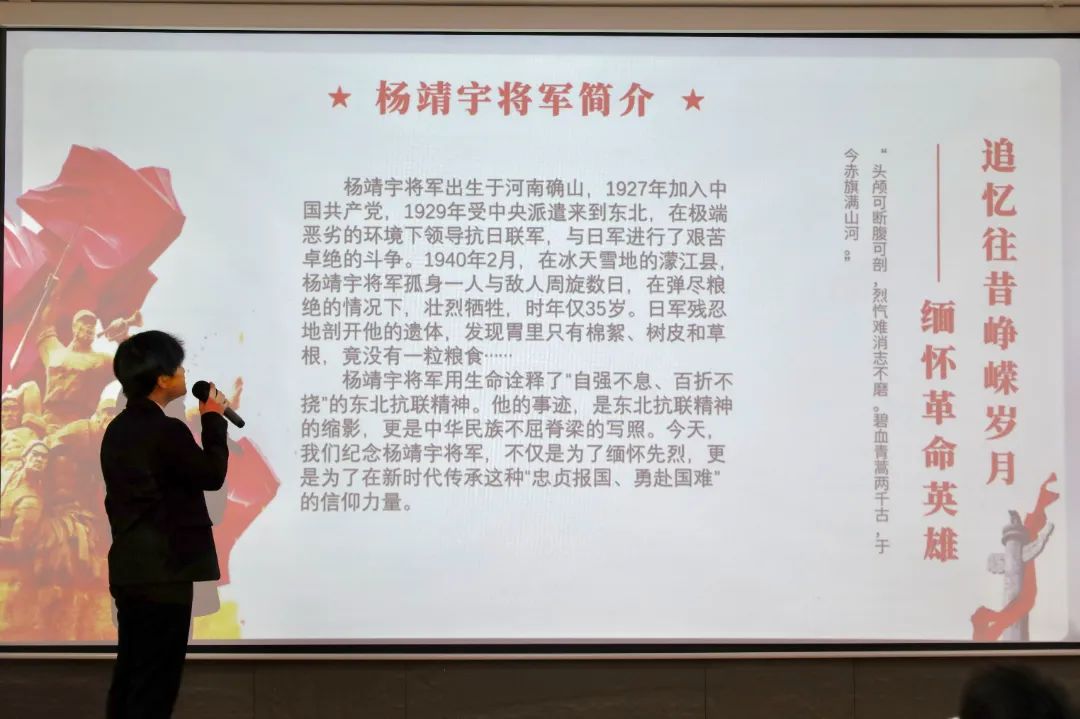 岁月长河奔腾不息,杨靖宇将军的英雄事迹始终熠熠生辉。在张文韬同学的讲述下,大家深刻体会到杨靖宇将军用生命诠释“自强不息、百折不挠”的东北抗联精神。他的事迹,是东北抗联精神的缩影,更是中华民族不屈脊梁的写照。作为新时代青年,不仅要怀着崇敬的心情缅怀杨靖宇将军,更应该传承这种“忠贞报国、勇赴国难”的信仰力量。