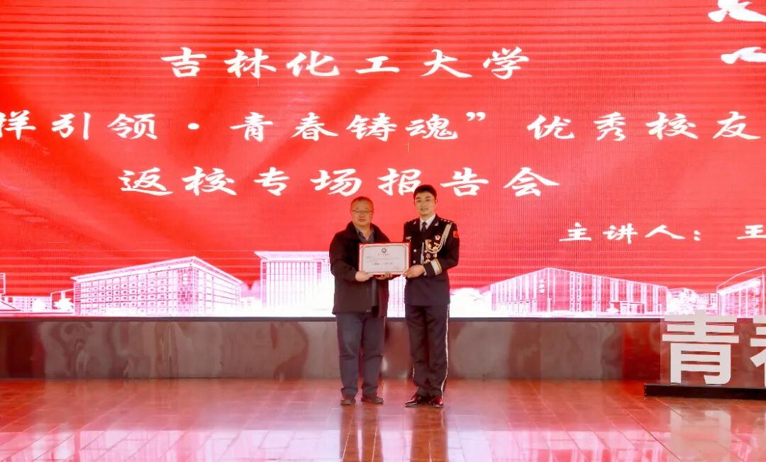 3月25日,我校2007级化学工程与工艺专业优秀校友、全国道德模范、吉林出入境边防检查总站通化边境管理支队民警王铁映应邀回到母校,为广大师生作专题报告。报告会前,学校领导在机关楼会客厅亲切接见了王铁映校友,详细了解其扎根基层、服务群众、荣获“全国道德模范”光荣称号的奋斗历程,对他长期以来心系母校、为校争光表示高度赞赏。学校党委书记张明耀为其颁发“‘青春榜样•社会实践’导师”聘书,勉励他继续以榜样力量引领在校学子成长成才;校长艾学忠为其颁发“吉林化工大学纪念版毕业证书”,以此表达母校对校友的深厚情谊与特殊礼遇;党委常委、副校长孙大志向其赠送学校主题邮票纪念册,寓意传承化大精神、共叙校友情谊。