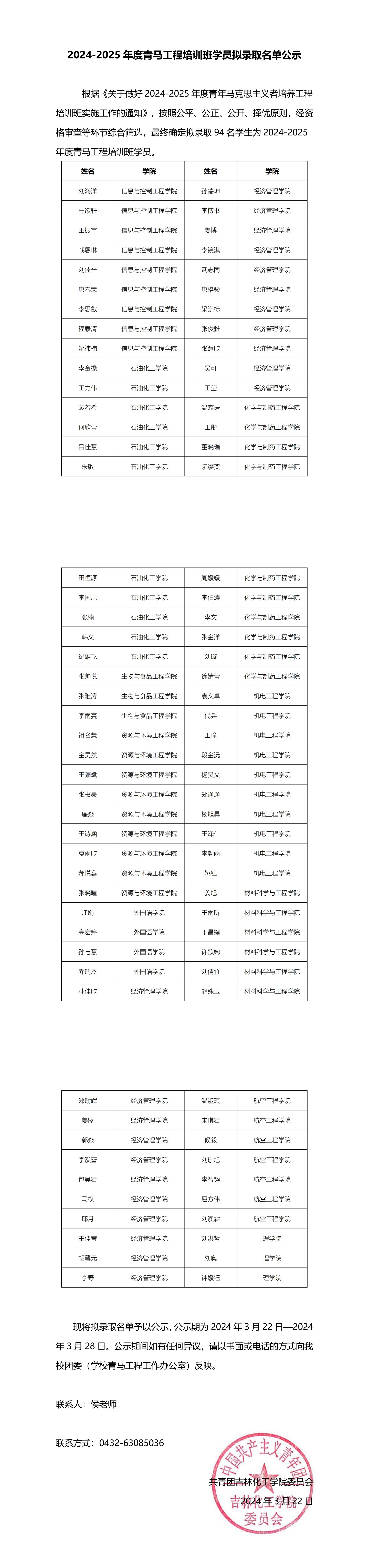 2024-2025年度青马工程培训班学员拟录取名单公示