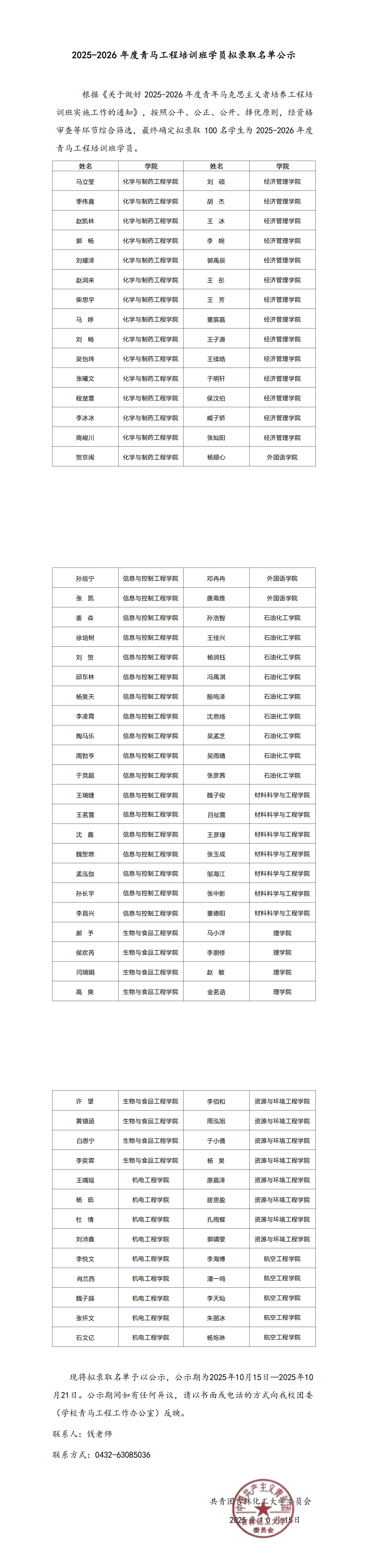 2025-2026年度青马工程培训班学员拟录取名单公示