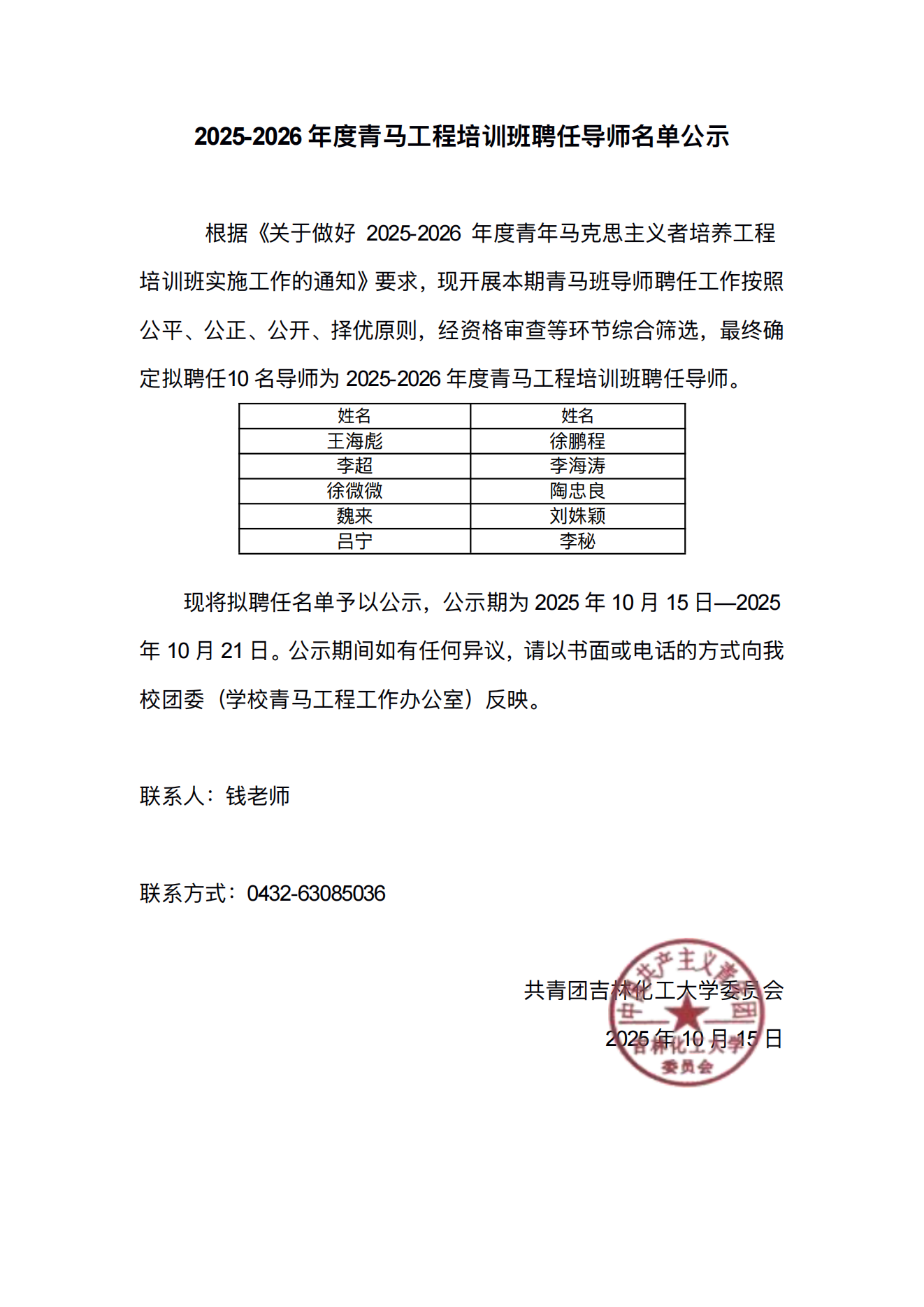 2025-2026年度青马工程培训班聘任导师名单公示