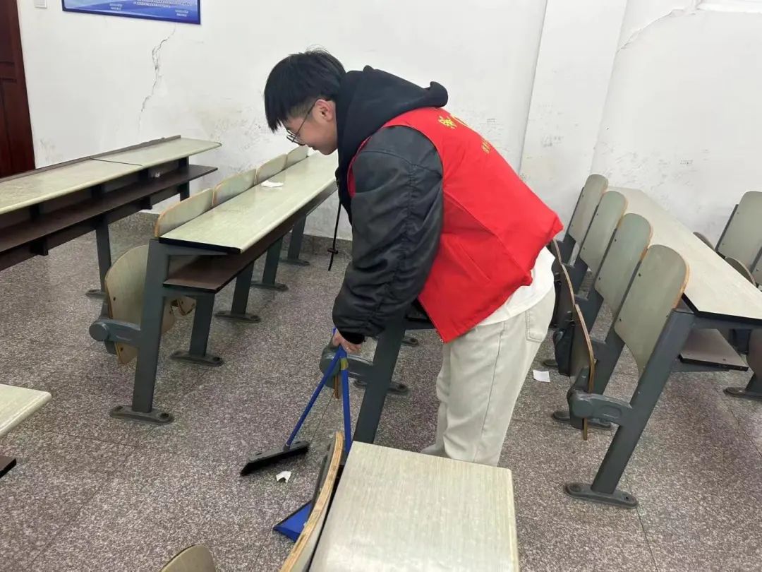 志愿者们深入教学楼内展开卫生大扫除、清算卫生死角、清除废弃烟头等活动,帮助整治脏、乱、差环境。