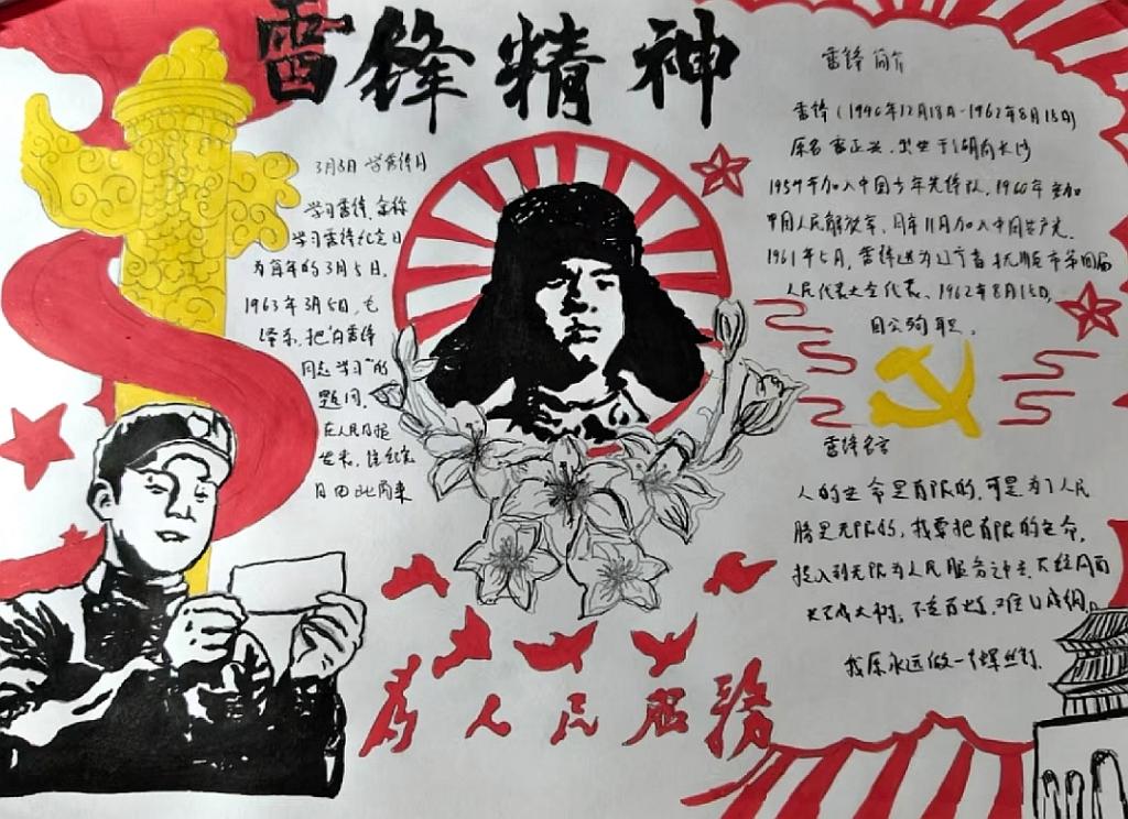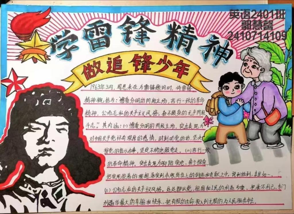 每年的3月5日是学雷锋纪念日,弘扬雷锋精神,对培养学生的社会责任感、创新精神和实践能力有着深远的意义。为了让同学们更深刻地理解雷锋精神,传承和发扬雷锋精神,外国语学院特开展“雷锋精神伴我行”手抄报评比活动。
