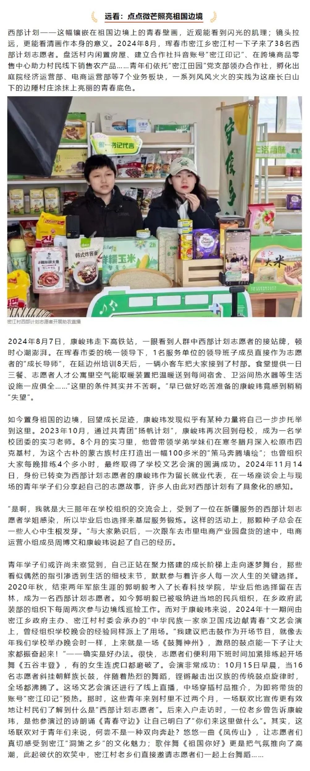 2024年西部计划优秀志愿者康峻玮的抉择不仅源于个人理想,更与吉林省“卫国戍边”专项的号召紧密相连。作为西部计划“卫国戍边”精神的践行者,他将其专业知识转化为稳边固边的实际行动,被中国共青团杂志以《镶嵌在边境线上的青春壁画》为题深度报道,生动诠释了新时代青年“在祖国坐标系中定义人生价值”的担当。