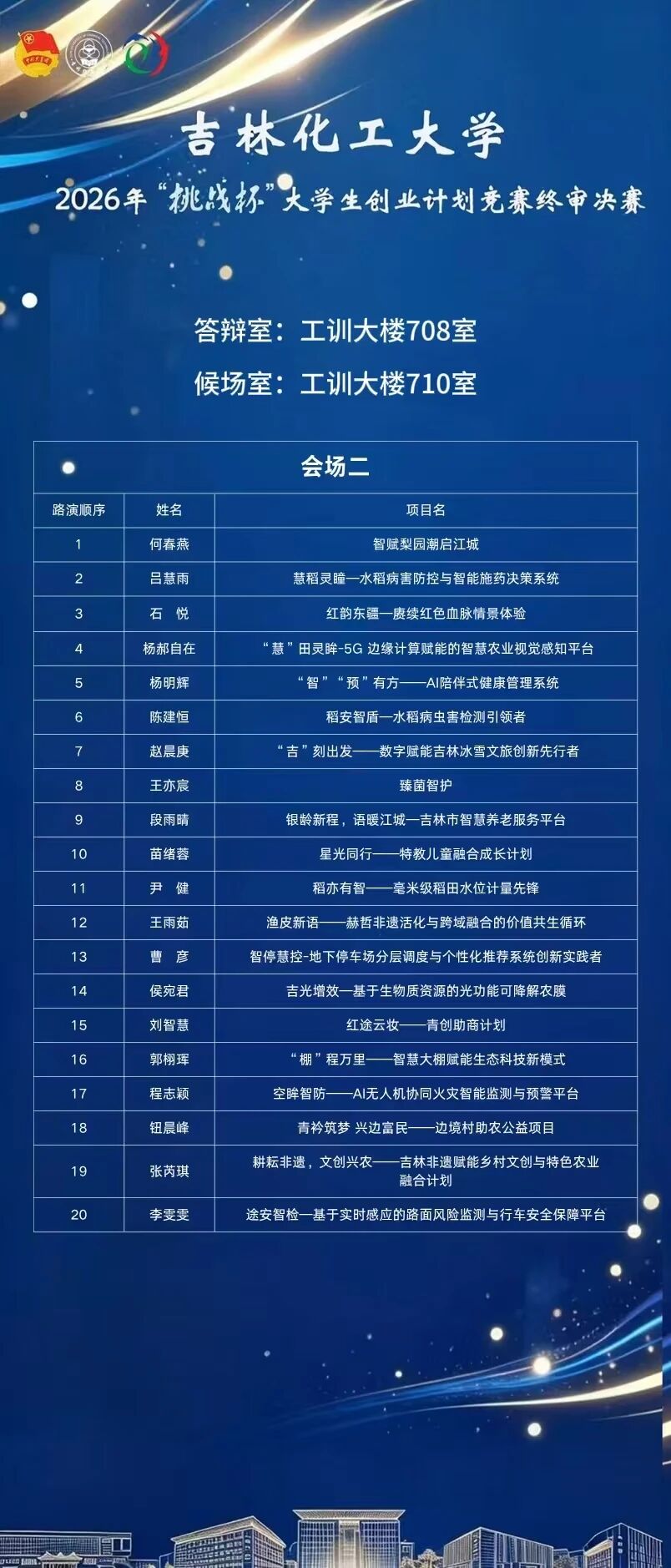 为进一步强化科创育人实效,激发青年学子创新活力,学校团委将于4月15日举办吉林化工大学2026年“挑战杯”大学生创业计划竞赛终审决赛。本次赛事旨在搭建创新创业交流展示平台,引领广大青年在实践中锤炼本领、增长才干,全面营造崇尚创新、勇于创业的校园氛围,现公示各团队答辩分组情况。